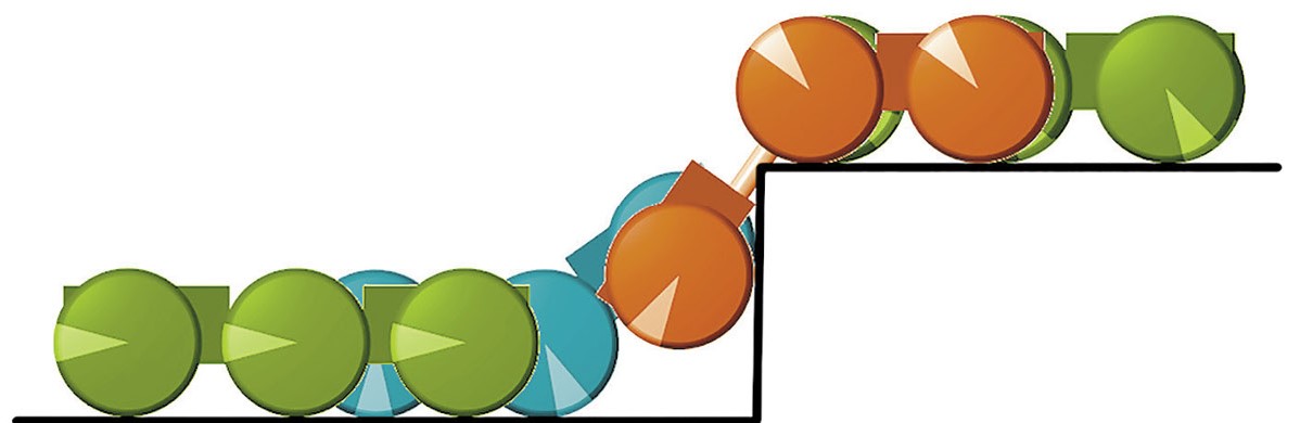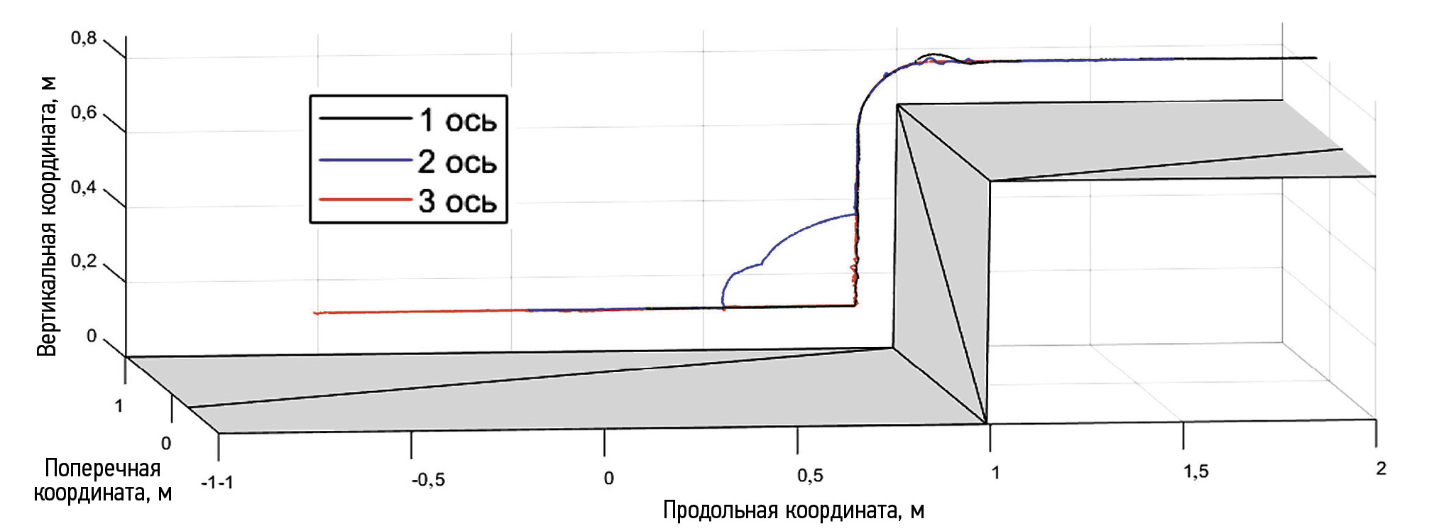 На рис. 10 представлены траектории колёс МР для рассматриваемого заезда. Необходимо отметить, что высота уступа значительно превосходит размеры движителя МР и он не может быть преодолён иначе как с использованием алгоритма управления складыванием и раздвижением секций, что продемонстрировано на рис 7.