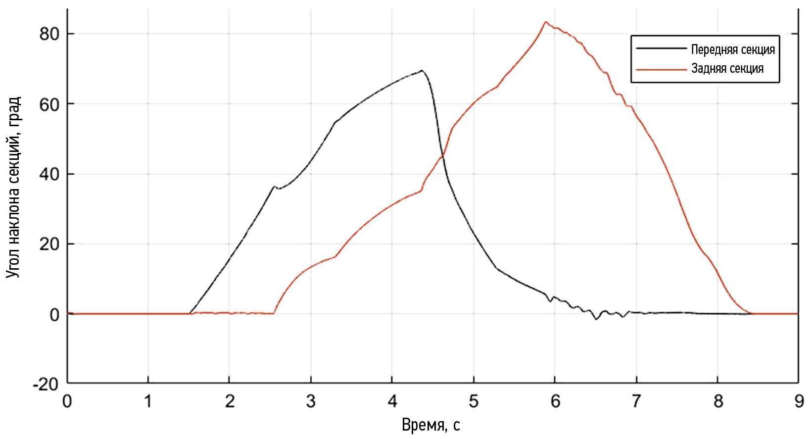 На рис. 11 показана запись изменений углов наклона секций МР по отношению к горизонту в продольном направлении. Необходимо отметить достаточно большие значения указанных углов (до 80 градусов), реализуемые при преодолении препятствий. В связи с этим очевидно, что в режиме ручного управления оператором такие режимы движения связаны с риском опрокидывания МР, что делает задачу разработки алгоритмов автоматического управления движением особенно актуальной. Таким образом, можно заключить, что полученные результаты демонстрируют работоспособность модели и её пригодность для разработки алгоритмов управления МР.