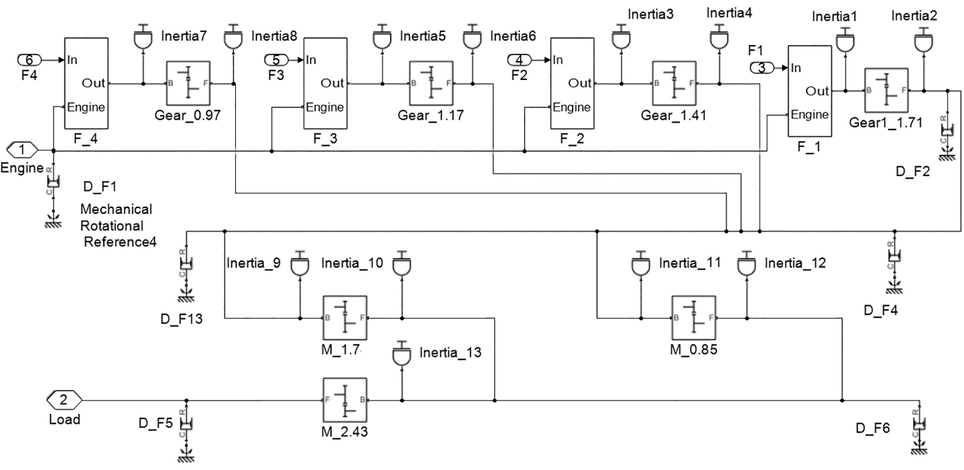 The input shaft of the gearbox is represented by sections connected at the input to the engine port and at the output to the subsystems F, which represent friction units.