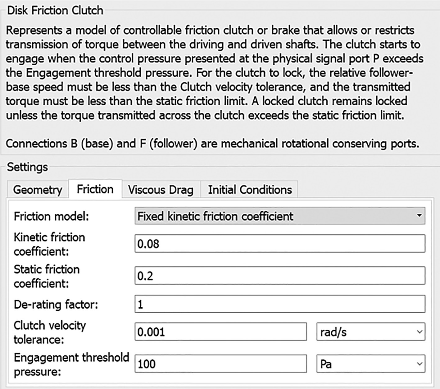 A typical disk friction clutch block is a friction clutch with sets of friction discs. The clutch is bi-directional, allowing it to slide in both positive and negative directions. The block provides a physical signal input port for applied pressure to the friction discs. The window of the block parameters is presented in Figure 3.