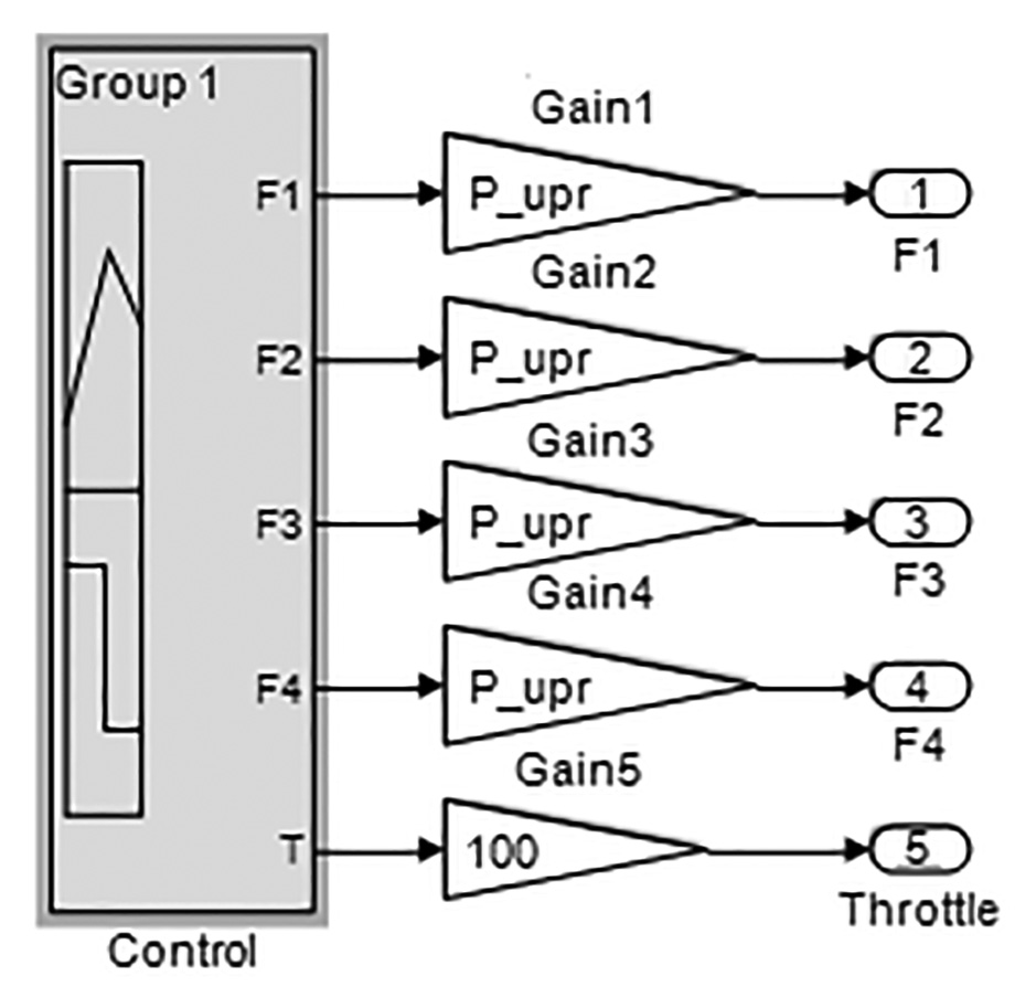 Figure 4 depicts the control subsystem is. The signal builder block in the subsystem generates control actions for the friction units F_1, F_2, F_3, and F_4 of the gearbox and the fuel supply to the throttle engine cylinders. The gain blocks convert friction clutch control movements into pressure with a maximum value of 0.9 MPa and fuel supply as a percentage of the maximum value (100%).