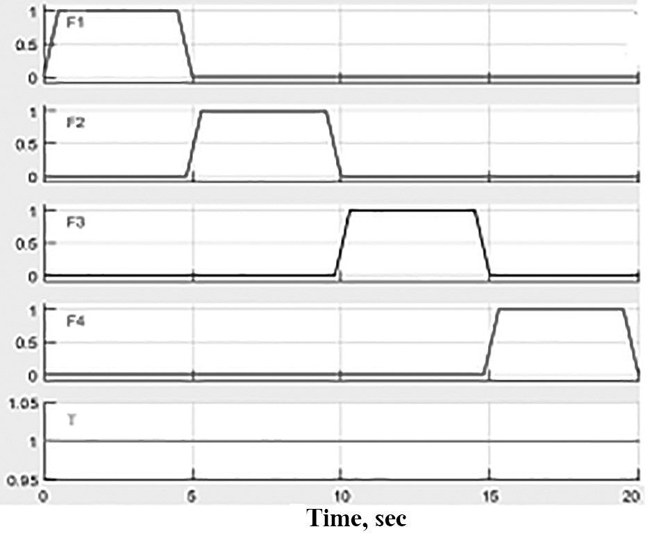 Fig. 6. Signals of control actions to automatic transmission clutches (F1, F2, F3, F4) and fuel supply to the engine (T) when simulating the shift process from 1st to 4th gear