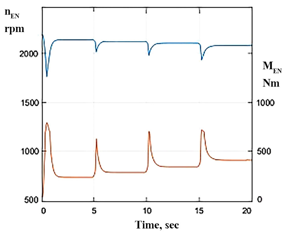 At the beginning of the machine movement process, the friction clutch F1 is activated according to a linear law of increment from zero to 0.9 MPa for 0.45 seconds. This takes into account the joint operation of the engine and transmission. At this time, the friction moment of the F1 clutch is the resistance moment for the crankshaft and the driving moment for the CG input shaft. The engine speed decreases slightly (due to the increase in the frictional moment of the friction clutch F1) as the engine torque increases.