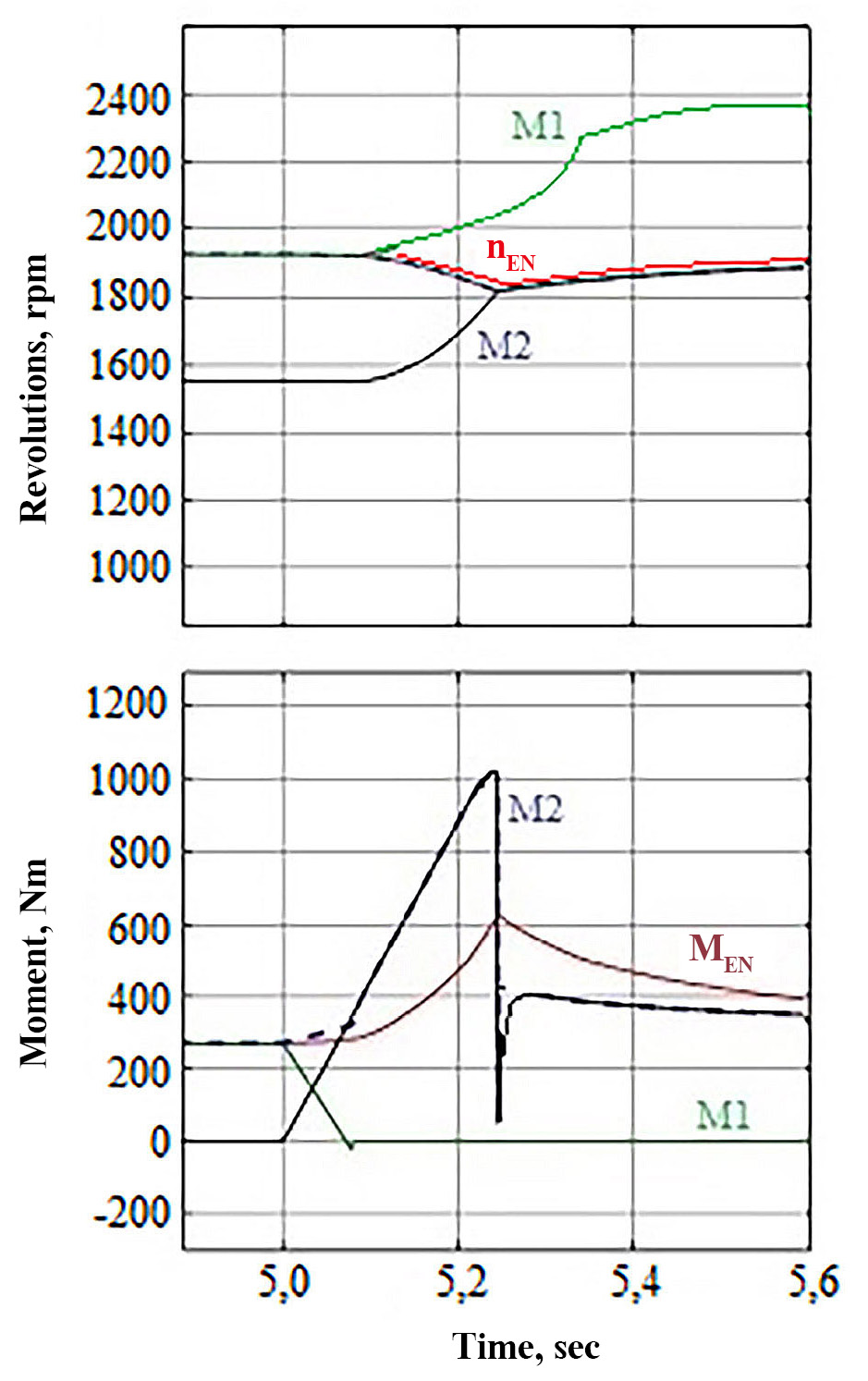 Following the completion of the revolution synchronization of the driven and driving parts, the torque in the activated friction clutch rapidly decreases to the value of the reduced moment of resistance.
