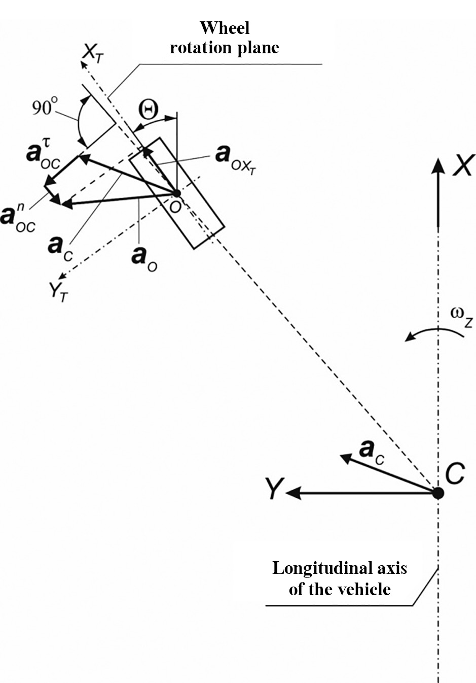 In Figure 1, C is the center of mass of the vehicle; О is the center of the vehicle wheel; CXY represents axes of the coordinate system associated with the center of mass of the vehicle; ОXTYТ represents the coordinate system axes associated with the center of the vehicle wheel; aC represents the vector of acceleration of the vehicle mass center; aO represents the vector of acceleration of the vehicle wheel center; represents the vector of tangential acceleration; is the vector of normal acceleration; represents the current linear vector of acceleration projection, aO of the center O of the wheel on the XТ axis; Θ is the angle of rotation of the controlled wheel; ωZ is the angular speed of the vehicle rotation about the vertical axis.