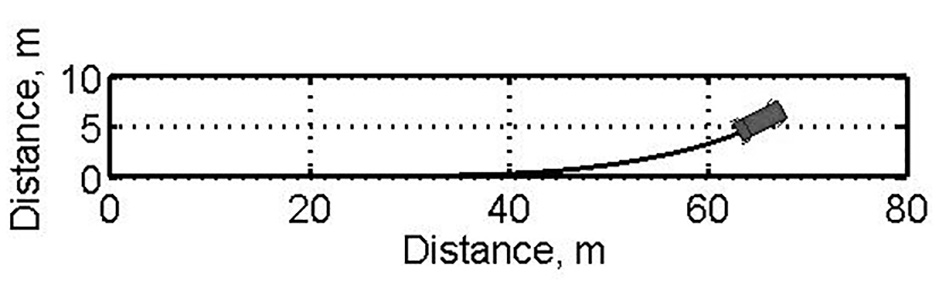 Using simulation modeling methods in testing the performance and efficiency of the proposed algorithm, it was discovered that emergency braking on a slippery road (coefficient of adhesion at full slip 0.35) of a passenger vehicle with a gross weight of 6000 kg at an initial speed of 60 km/h with a simultaneous turn of the steering wheel (the driver’s attempt to bypass the obstacle) causes front axle drift. The trajectory of the vehicle’s motion during braking is presented in Figure 2.