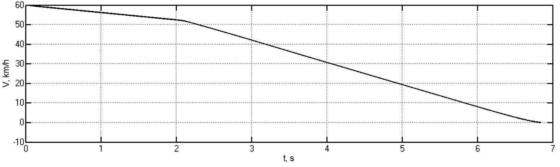 Введение Одним из путей решения проблемы повышения активной безопасности автомобилей при торможении является применение антиблокировочных систем (АБС). Законодательные органы ряда стран, признав этот факт, побуждают производителей автомобилей внедрять АБС. Так, в России все автобусы категории М2 с числом пассажирских мест свыше 8 в обязательном порядке оснащаются АБС (в ЕЭС с 2004 года АБС оснащается каждый новый автомобиль). Одновременно совершенствуются алгоритмы управления работой АБС, что обеспечивает повышение уровня контроля над параметрами движения автомобиля при торможении. По параметрам регулирования АБС подразделяют на следующие типы [1 - 6]: · по значению коэффициента скольжения колеса, соответствующего максимуму сцепления колеса (s-регулирование); · по максимальному значению коэффициента взаимодействия (μ-регулирование); · по значению и знаку параметра dμ/ds, характеризующего степень приближения к максимуму сцепления (градиентное регулирование). При использовании s-регулирования, как правило, пменяются следующие основные алгоритмы и их комбинации [7-13]: · использование режима равенства углового замедления колеса и линейного замедления автомобиля; · определения коэффициента скольжения колеса и его дальнейшее поддержание в заданных пределах; · использование порогового замедления тормозящего колеса. Большинство недостатков s-регулирования обусловлено тем, что ни проскальзывание, ни замедление колеса не несут достаточной информации для определения оптимального управления тормозными усилиями. Основными проблемами в обеспечении работы АБС, построенных на разных принципах и с разными параметрами регулирования, являются невозможность непосредственного определения скорости автомобиля, следовательно - коэффициента скольжения, а также невозможность эффективного реагирования на изменение дорожных условий при торможении. Цель работы: повышение устойчивости и управляемости двухосных автомобилей при торможении за счет адаптивного перераспределения тормозных усилий на колесах. Алгоритм оценки параметров движения автомобиля при торможении В процессе торможения с увеличением тормозного момента колесо, как известно, замедляется. В определенный момент времени замедление колеса превышает величину, которую замедление автомобиля физически превысить не может. Дальнейшее увеличение тормозного момента увеличивает исключительно замедление колеса, а не транспортного средства. Физическое замедление автомобиля определяет пороговое значение замедления колеса, и можно приближенно вычислить так: где - проекция текущего линейного вектора ускорения центра О колеса (рис. 1) на плоскость его вращения; - статический радиус колеса. Рис. 1. План ускорений для центра колеса при криволинейном движении автомобиля Fig. 1. Acceleration plan for the center of the wheel during curvelinear motion of vehicle Для определения рассмотрим план ускорений для центра колеса при криволинейном движении автомобиля и примем допущение о том, что плоскость качения колеса перпендикулярна ровному опорному основанию. Ускорение (рис. 1) точки О (центр колеса) при плоском движении равно векторной сумме ускорения центра масс автомобиля (точка С) и ускорения точки О при вращательном движении вокруг полюса С: (1) На рис. 1 обозначено: C - центр масс автомобиля; О - центр колеса автомобиля; CXY - 