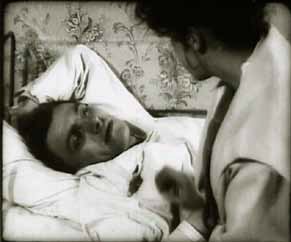 В картине «Барышня и хулиган» герой Маяковского чаще следит взглядом, нежели что-то им изображает, то есть, «говорит» (тревожное вглядывание, агрессивное «зырканье», насмешливое вскидывание глазами, робкий отвод глаз и т.п.). Но наиболее выразительным, по определению, оказывается пристальный взгляд в объектив, и таких жеста-изображения всего два: первый на протяжении двадцати секунд «показывает и говорит» любовь в сцене провокационного письменного признания в классе; второй — в сцене смерти героя, когда к постели умирающего приходит героиня, и он смотрит на нее, моля о любви. И в первом случае взгляд можно квалифицировать как своего рода «поцелуй в диафрагму», поскольку изображение уходит в затемнение, и долгий взгляд героя означает перерождение хулигана в безнадежно влюбленного, а следовательно, предвещает некий поворот сюжета. Очевидно, «изобразить любовь» взглядом удалось как раз за счет длительности плана, а исполнитель здесь не мог переиграть, поскольку не владел техникой «кривляния» и просто сыграл, как мог, в «русском стиле» влюбленного, пораженного стрелой Амура. Но в результате действия синэстетического эффекта взгляд-жест героя в контексте сюжетного действия прочитывается как метаморфоза любви.