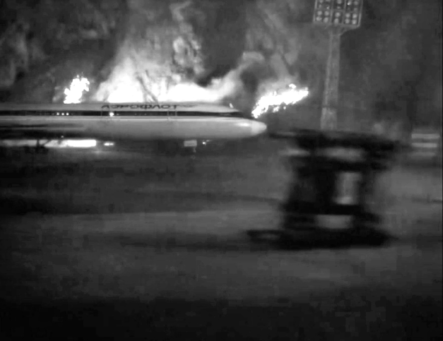 Третье «ударное» событие — взлет самолета. Финальная сцена взлета Ту-154 проходит на фоне взрывающегося нефтезавода. Огонь следует за воздушным судном по геометрически точным линиям, в то время как внутри самолета экипаж борется за спасение людей. Режиссер накаляет ситуацию катастрофы до предела, создавая монтажную «симфонию» борьбы жизни и смерти. Самолет с трудом взлетает в воздух, а спустя миг взлетная полоса вспыхивает огнем. Человек побеждает разгулявшуюся стихию.