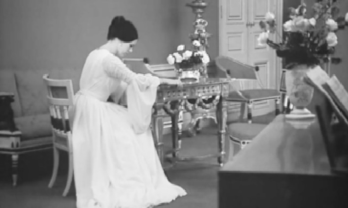 Сцена из фильма. Агнес вдыхает аромат искусственного цветка