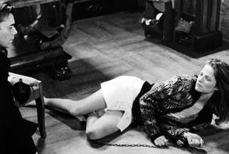 В данном случае Л.Кавани отсылает зрителей к реконструированному эпизоду, когда Лючия в толпе обнаженных заключенных, ведомых на «заклание», проходит перед Максимилианом. Он выделяет ее, и его ассистент высвечивает ее фигуру светом софита, а камера фиксирует это Режиссер не дает в картине никаких отсылок к детству героев, выстраивая отражение их комплексов в момент, когда они находятся во взрослом состоянии. Лючия появляется в судьбе Максимилиана волею случая, но подобная ситуация становится возможной в результате его стремления реализоваться в условиях неограниченной власти. Подавленный мазохистский комплекс Максимилиана делает из него чудовище, которое жаждет физической власти. Реализация такого стремления достигается тогда, когда его воля сосредоточена на решении вопроса жизни и смерти заключенных, их полной зависимости. Упоение чувством безнаказанной власти становится для Максимилиана тем омутом, в котором он топит свое, неосознаваемое желание быть зависимым, подчиненным и униженным. Такое поведение характерно в условиях жесткого воспитания и изначального подавления личности.
