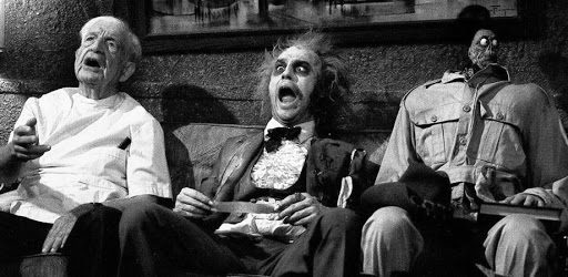 Битлджус (в центре) в зале регистрации смертей. Фильм «Битлджус», 1988 год. Режиссер Тим Бёртон
