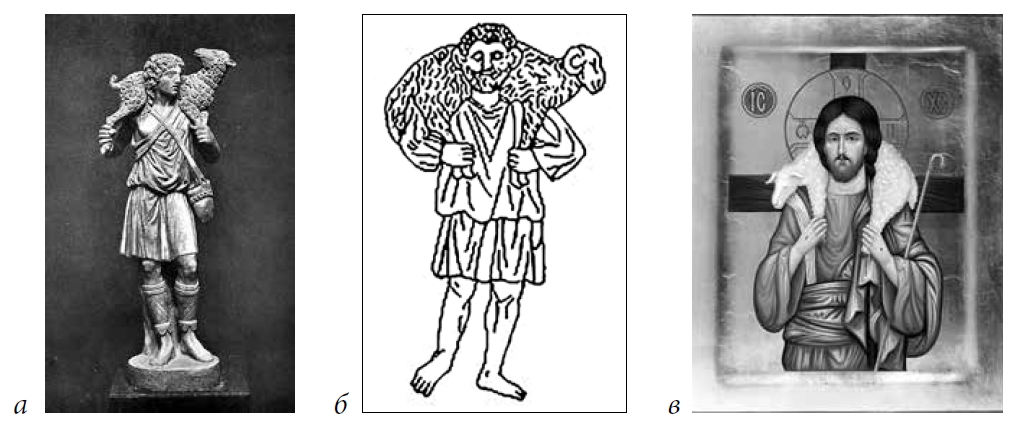 На рисунках прослеживается связь с Криофором (др. греч. Κριοφόρος — «несущий барана» — эпитет бога Гермеса несущего агнца) и иконографией Доброго Пастыря. «Сходство <…> в иных случаях настолько значительно, что ставит исследователя в затруднительное положение: как отличить христианское изображение Доброго Пастыря от языческого?», — замечает по этому поводу Н.В.Покровский 4. Например, на рис. 2 мы видим изображение Гермеса с агнцем, которое весьма похоже на изображение на рис. 1 а.