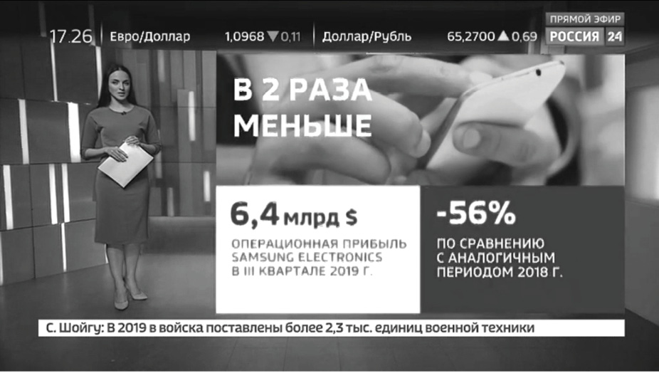 Выясняется, что структура экранного пространства изменяется как на стадии монтажа, так и во время съемки. Рассмотрим примеры его организации. На скриншотах кадров 4, 5 (телеканал «Россия 24») представлены (соответственно) элементы дополнительной визуализированной информации в фоновом рисунке мизансцены и «окна» дополненной реальности в виде виртуального стенда в экранном пространстве кадра (см. кадры 4, 5). Таким образом, полиэкран визуально концентрирует объем кадра, приводя к уплотнению объектов в композиции и их зрительному сближению. Например, репортер, отображаемый в кадре с ведущими новостного выпуска, на самом деле может находиться на значительном расстоянии от студии.