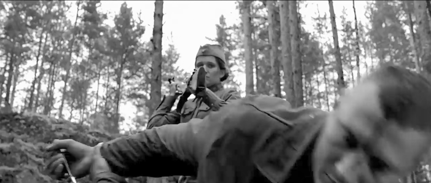 Действительно, выбор постановочного действия кульминационной сцены поединка был выстроен предельно точно. Неожиданный удар прикладом врага по голове — естественная и психологически оправданная реакция неопытной девушки, вставшей на защиту соотечественника в экстремальной ситуации.
