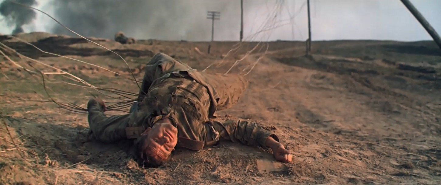 Актерская достоверность «расстрела» на экране выглядит столь естественно, что не вызывает ни тени сомнения в подлинности происходящего. Но почти в тот же момент оператор (И.М.Слабневич) делает небольшой отъезд камерой назад, и зрительскому взору открывается полная картина произошедшего. Расстрелянный советский майор Максимов лежит, будто закрывая землю, на небольшом пригорке, на оборванных линиях (телефонных, телеграфных) передач, а мрачно стоящие и слегка наклоненные, покосившиеся столбы, похожие на могильные кресты, молча склонившиеся над погибшим. Они тоже разрушены и искалечены войной, как и безоружный человек с простреленной грудью.