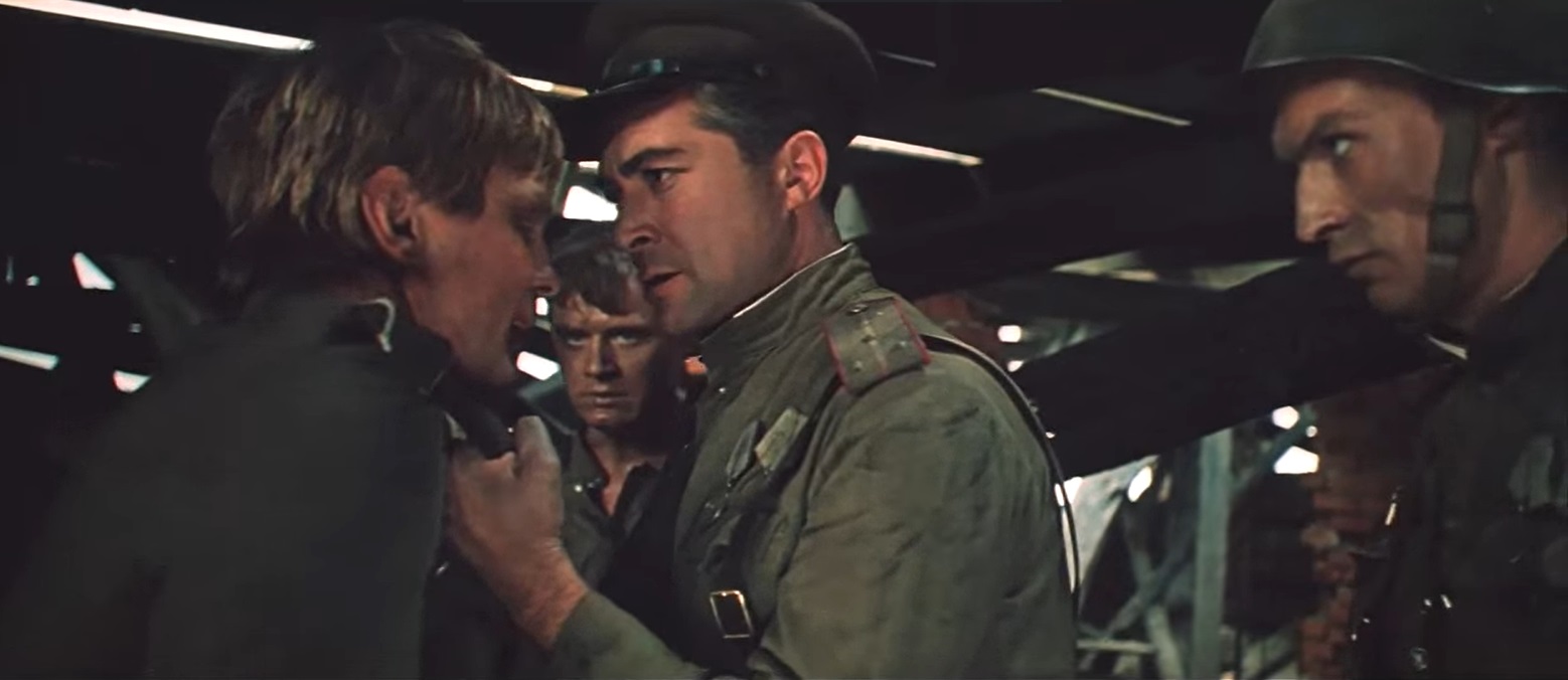 Рядовой Сашка (актер – С.П.Никоненко) приводит на командный пункт, находившийся в развалинах дома, взятого в плен снайпера-«власовца» (актер – Ю.В.Назаров), стрелявшего по наступающим советским солдатам из полуразрушенной церквушки. Когда капитан Цветаев (актер – Н.В.Олялин) начинает допрашивать предателя, тот, испугавшись, говорит, что не понимает по-русски. Но в разговор вклинивается капитан Орлов (актер – Б.И.Зайденберг) и отдает приказ расстрелять «власовца». Тут же предатель бросается на колени, взмолившись: «Товарищи!.. Погодите, постойте!.. Поймите, не своей же волей… У меня жена в Арзамасе… Товарищи!.. Поймите же!» 7.