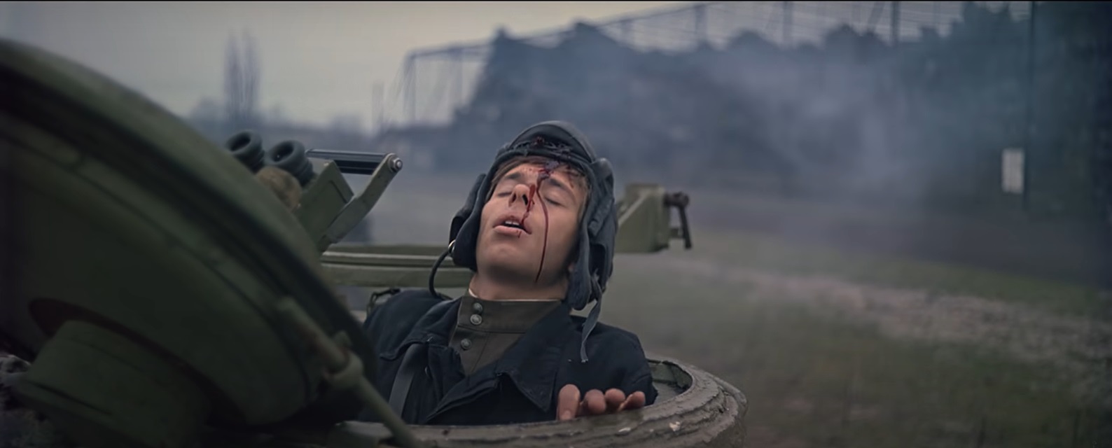 Этот подвиг предстает как олицетворение не только сформированного кинообраза советского солдата, солдата-освободителя, но и подвиг всего многонационального советского народа, вставшего на борьбу против фашистской Германии. В этот момент в когнитивное восприятие зрительской аудитории неизбежно вторгается ассоциация, что вооруженные гитлеровцы боятся безоружного русского солдата и потому расстреливают его не как равного себе противника, а из страха, опасаясь человека, вставшего на пути бесчестья и трусости. Но даже убитый майор Максимов, лежа на спине, с широко раскинутыми по сторонам руками, будто защищает простреленной грудью свою землю (в прямом и переносном смыслах). И как скорбный набат по павшим героям Великой Отечественной войны звучат в этот момент несколько аккордов из песни «Священная война» 4. Эти строгие звуки как бы завершают образ подвига героев, павших во время войны, многократно его укрупняя и возвеличивая на экране. Ведь подвиг советского солдата не имел национальности, он был интернациональным. В СССР проживало более 100 национальностей и народностей, и понятие советский солдат не отождествлялось ни с родом войск, ни с воинским званием, да и статус его был абсолютно не важен — генерал или рядовой 5. В битве за Родину все были равны. Современная же кинематографическая интерпретация образа солдата Второй мировой войны, трактуемая внуками и правнуками реальных участников тех апокалипсических событий, — совершенно иная 6.