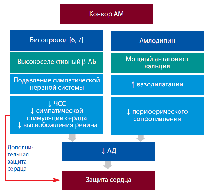 Говоря о ФК и молекулах, входящих в их состав, необходимо проводить анализ каждой из них в отдельности. Комбинация Конкор АМ представляет собой комбинацию лидеров двух классов: бисопролол и амлодипин (см. рисунок) [6–8], – предоставляющую комплементарную защиту сердца и контроль АД.