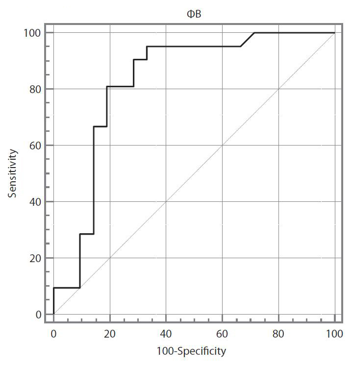 Рис. 2. Диагностическая значимость ФВ ЛЖ по данным 3D-ЭхоКГ как маркера кардиотоксичности у больных РМЖ. Чувствительность составила 81,0%, специфичность – 80,0%.