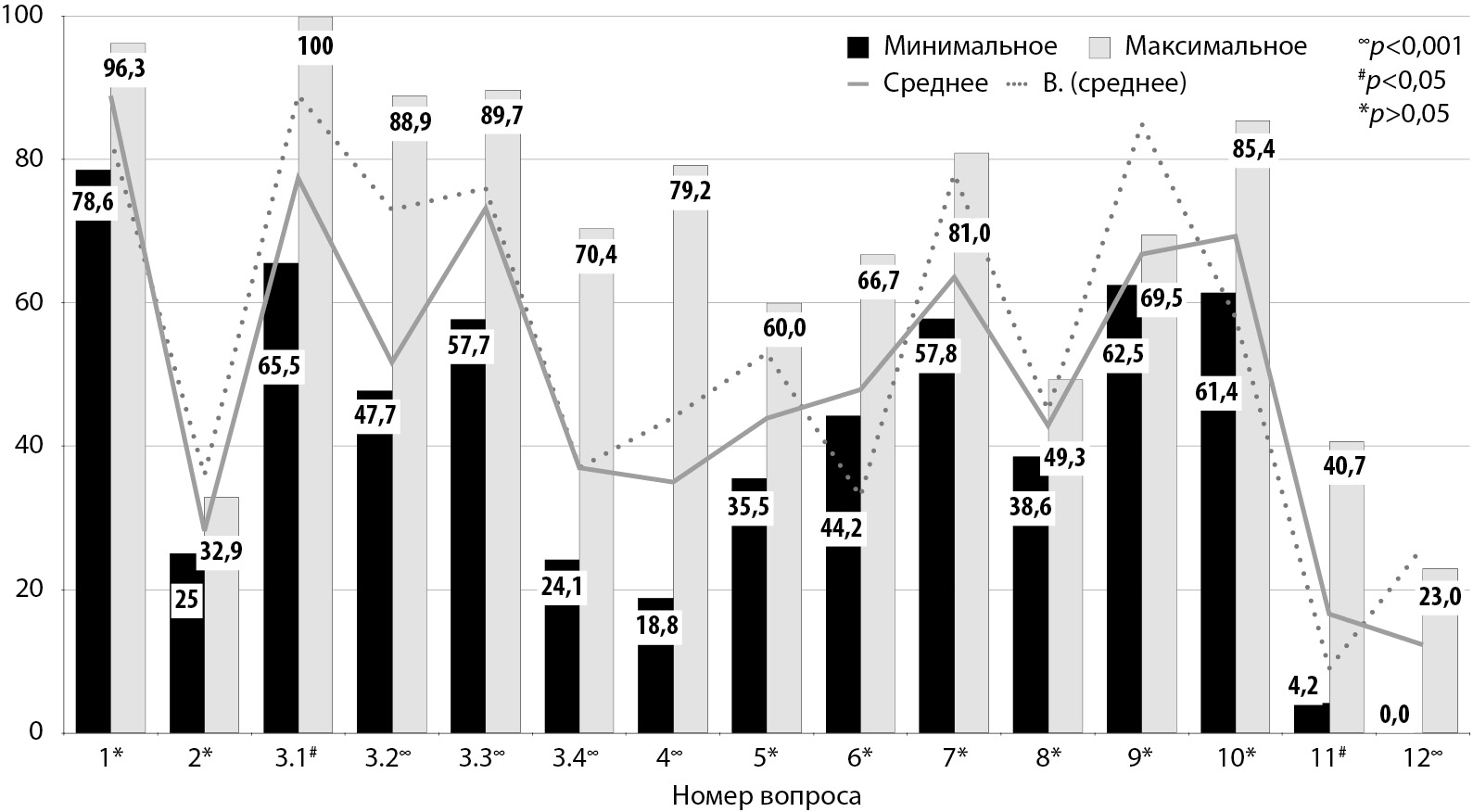 Рис. 1. Уровни полученных верных ответов (%) на вопросы анкеты с учетом среднего, минимального и максимального значений в разных центрах.