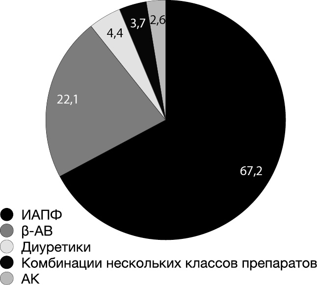 Рис. 2. Распределение неверных ответов на вопрос об оптимальном классе препаратов для начальной АГТ без учета специфических клинических ситуаций и ограничений (%).
