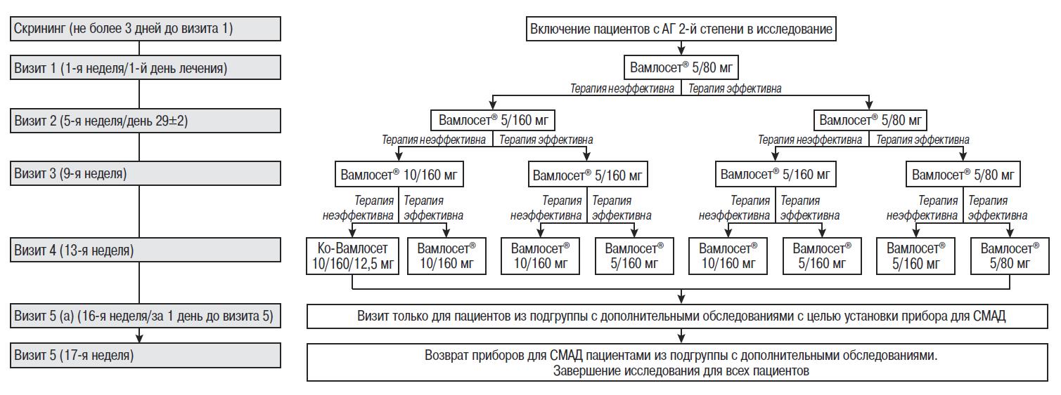 Вамлосет® (А/В) в дозах 5/80 мг, 5/160 мг, 10/160 мг и Ко-Вамлосет (А/В/ГХТЗ) в дозах 10/160/12,5 мг, 10/160/25 мг назначались в соответствии с инструкциями по медицинскому применению лекарственных препаратов. Ежедневный прием внутрь осуществлялся однократно в интервале 7:00–11:00 ч независимо от приема пищи. В дни клинических визитов пациенты принимали исследуемые АГП после измерения АД врачом-исследователем.