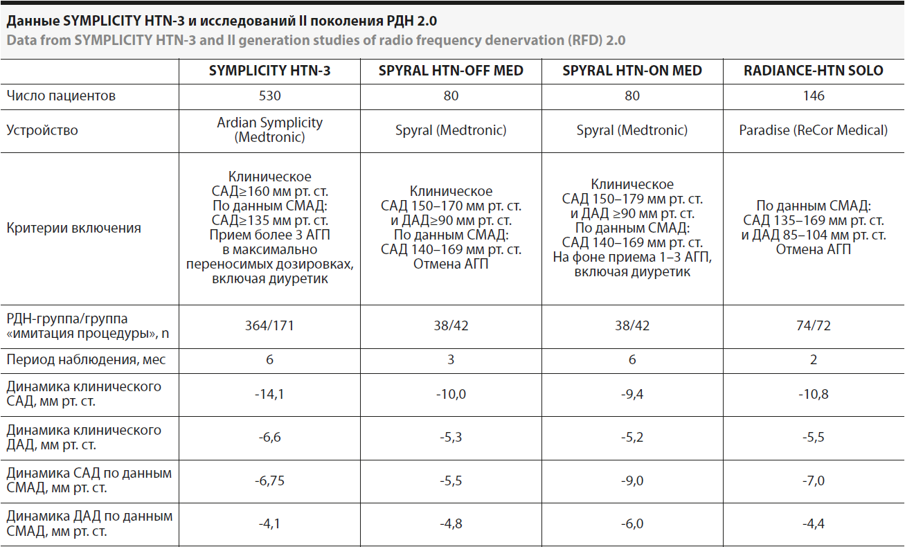 Все 3 исследования демонстрируют, что РЧ- или УЗ-РДН приводит к одинаковому и клинически значимому снижению САД у пациентов с умеренной или неконтролируемой АГ (в среднем на 10 мм рт. ст. по данным клинического измерения и 6–9 м рт. ст. по данным СМАД) в сравнении с пациентами, которым проводилась «имитация процедуры». Однако необходимы дальнейшие более крупные исследования для окончательной оценки эффективности снижения уровня АД и отдаленной безопасности метода.