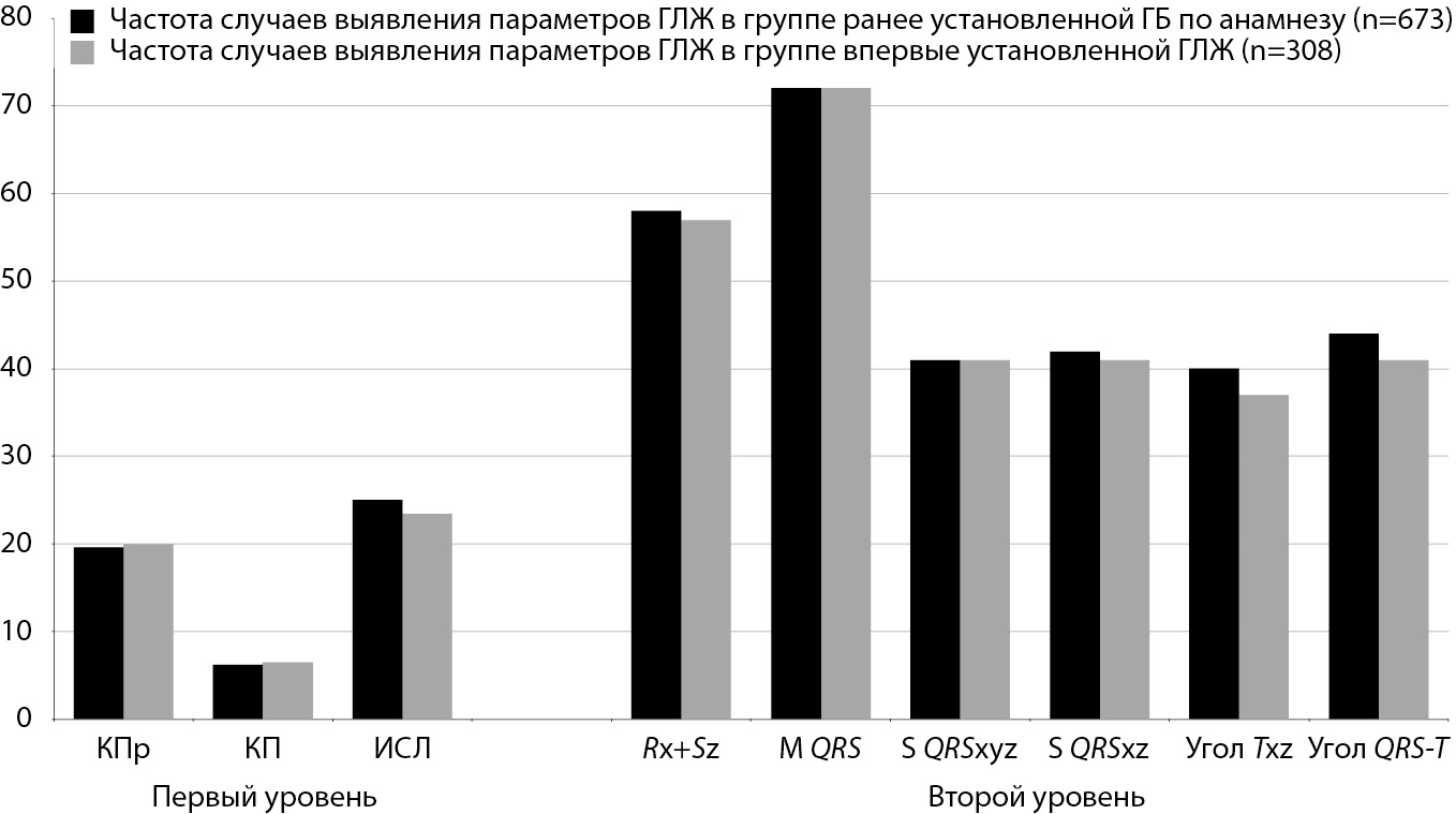 В табл. 1 и на рис. 1 представлены данные о частоте выявления параметров ГЛЖ по результатам анализа ЭКГ-12 (1-й уровень ЭКГ-диагностики) и ВКГ-диагностики ГЛЖ (2-й ВКГ- уровень). Группы с впервые и ранее выявленной ГБ показали одинаковую частоту выявления критериев ЭКГ- диагностики и одинаковую частоту выявления критериев ВКГ-диагностики ГЛЖ, т.е. можно предполагать, что степень АГ у этих пациентов была одинаковой. Чувствительность метода ЭКГ значительно уступала частоте выявления ГЛЖ при использовании пространственных характеристик электрического поля сердца.