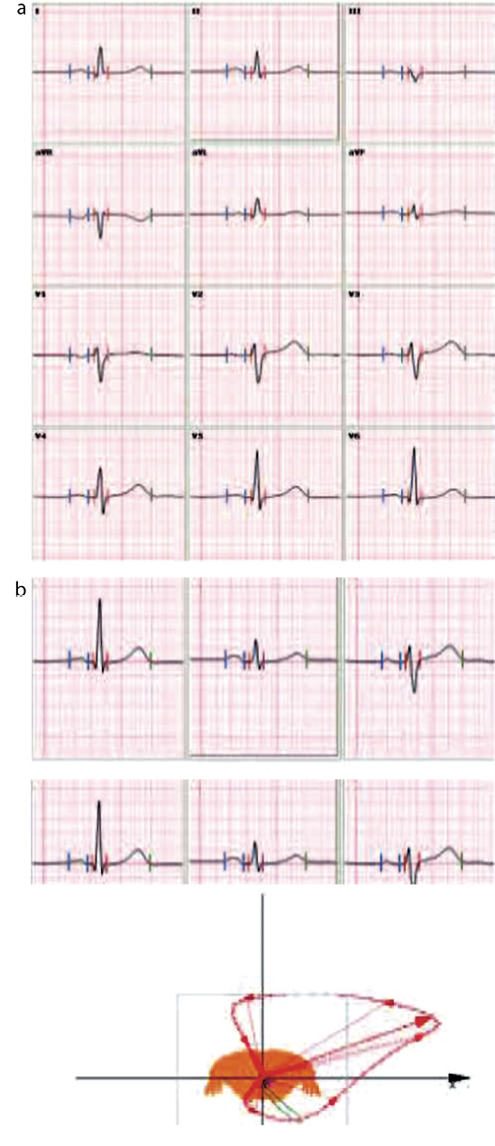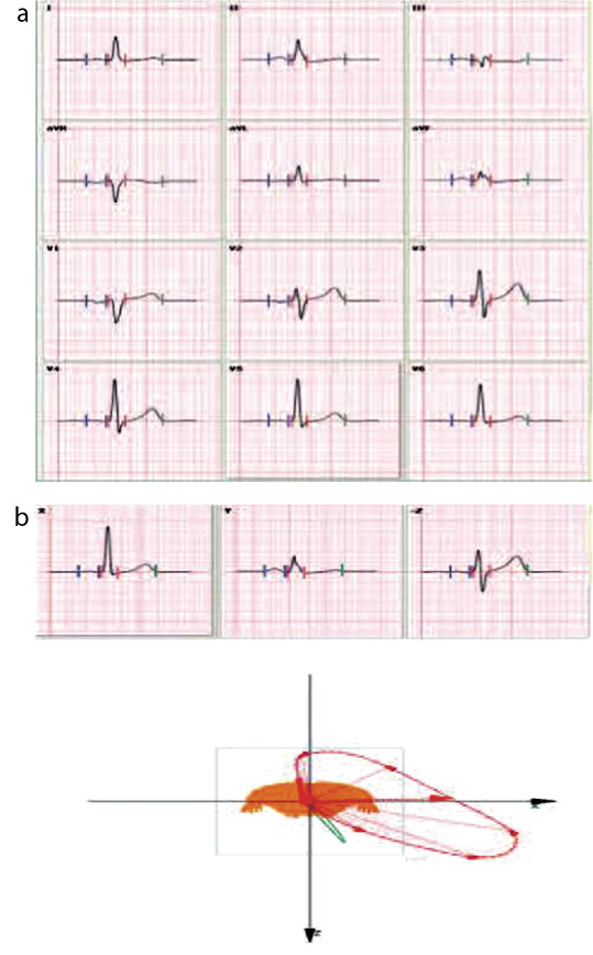 Рис. 3. ЭКГ-12 (а): КП=1510 мс×мм, КПр=1,61 мВ, ИСЛ=3,15 мВ; ЭКГ-3 и ВКГ (b): показатели: Rx+Sz=3,09 мВ, М QRS=2,29 мВ, S QRSxz=2,3 мВ2.