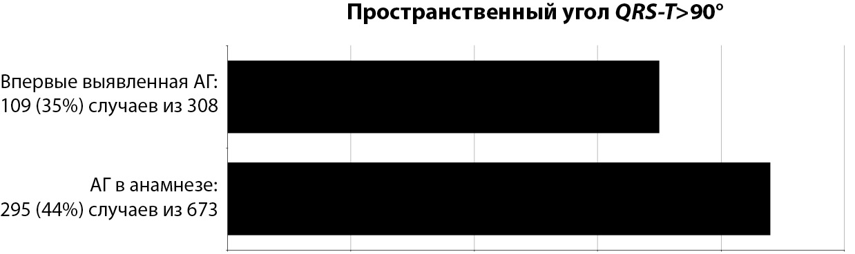 Рис. 4 иллюстрирует частоту выявления угла QRS-T>90° у пациентов с впервые и ранее выявленной АГ.