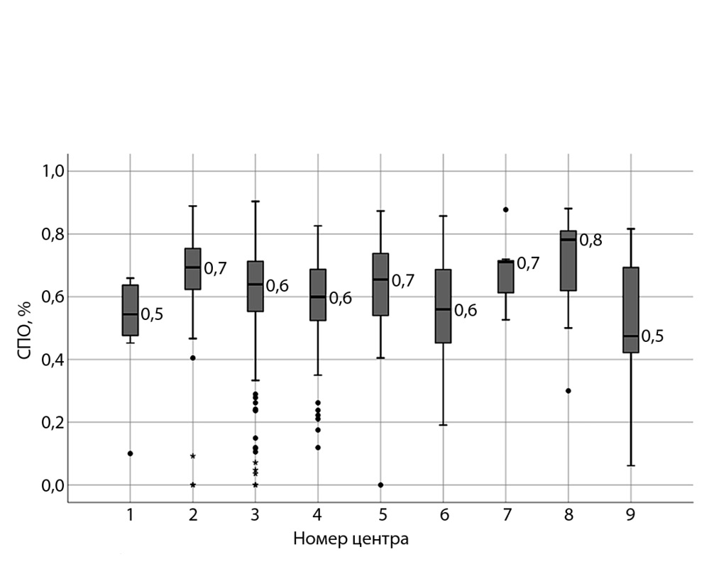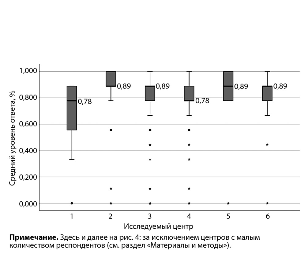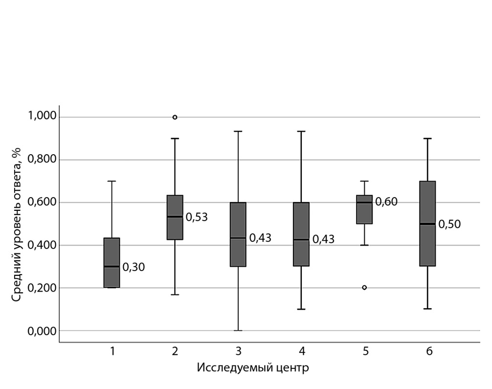 Выявление статистической разницы среди центров для вопросов с количественными данными произведено с использование непараметрического аналога дисперсионного анализа – критерия Краскела–Уоллиса с коррекцией уровня значимости р с учетом поправки Бонферрони при апостериорных парных сравнениях исследуемых центров между собой (статистическая значимость различий фиксировалось при р<0,05). Для расчета доверительных интервалов (ДИ) применялся метод Клоппера–Пирсона.