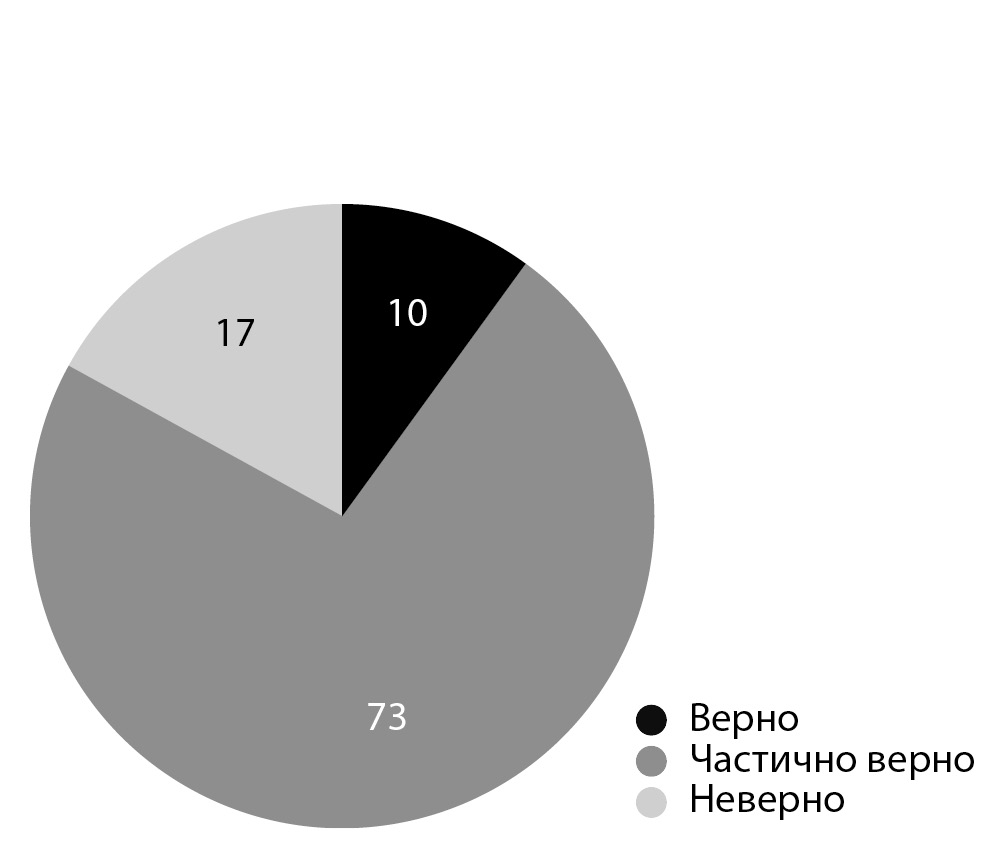 Анкета исследования содержала вопросы с предложенными вариантами ответов, а также вопросы, где респонденту предлагалось написать ответ самостоятельно. При подсчете результатов, в зависимости от степени полноты, относили к «неверным» ответы, получившие от 0 до 0,5 балла включительно, к «верным» – от 0,5 до 1. Следовательно, при всех верных ответах максимальный средний балл составлял 1,0. Среднее значение совокупности верных, частично верных и неверных ответов характеризовалось как «средний уровень полноты ответа» (СПО), эквивалентное понятие – «средний уровень правильности ответов».