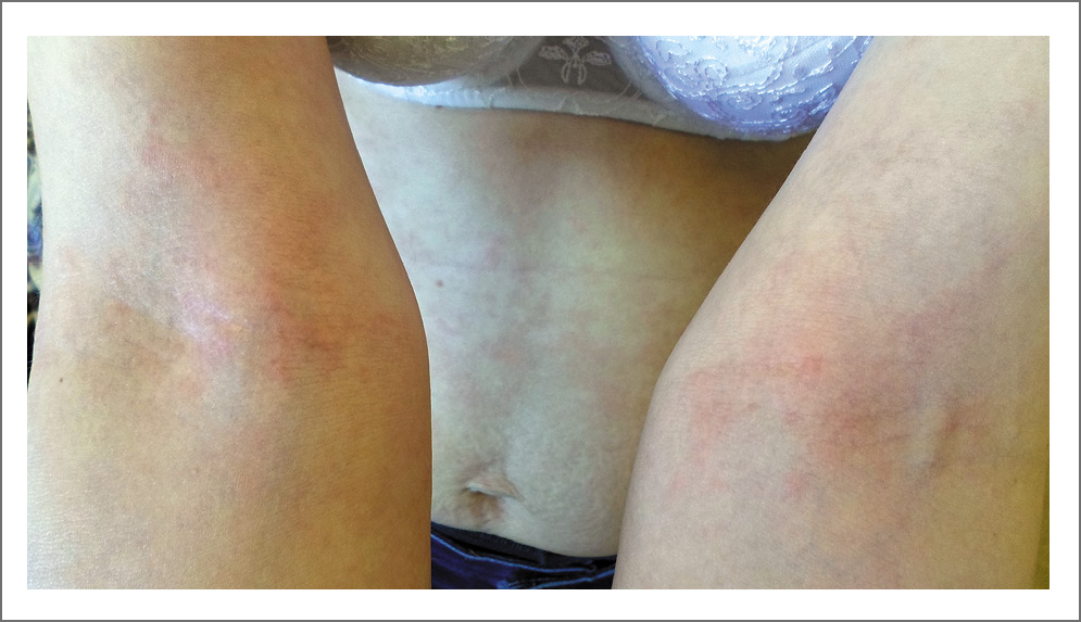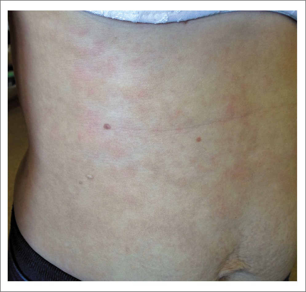Основными клиническими признаками АПКБ являются кожный зуд, экскориации и экзематозные поражения кожи. У 2/3 наблюдаются широко распространенные экзематозные изменения, поражающие типичные атопические участки, такие как лицо, шея и сгибательные поверхности конечностей, а у 1/3 – небольшие зудящие эритематозные папулы на туловище (рис. 1) и конечностях (рис. 2). Расчесывание вызывает ссадины и может привести к вторичным кожным инфекциям. Высыпания обычно проходят после родов.