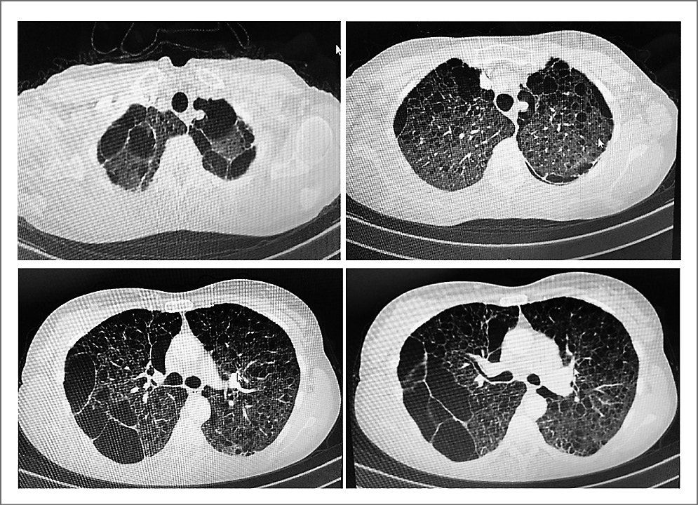 При КТВР органов грудной клетки (апрель 2019 г.) наблюдали множественные тонкостенные кисты до 10 мм во всех отделах; в верхней и средней долях правого легкого – множественные субплевральные буллы (рис. 1).