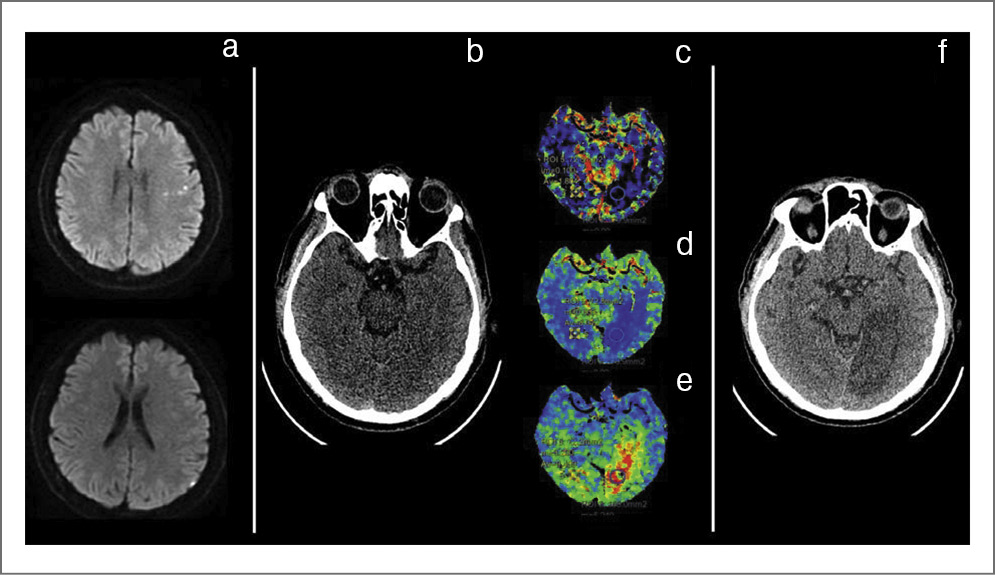 Пациент 63 лет в 2020 г. перенес ИИ в бассейне левой средней мозговой артерии (рис. 1, a, диффузионная магнитно-резонансная томография) с полным регрессом неврологического дефицита. При обследовании выявлена пароксизмальная форма ФП, назначен ПОАК, который пациент не принимал. Внезапно 21 марта 2022 г. возникло нарушение зрения и неловкость в правой руке. Поступил в стационар через 12 ч от момента развития симптомов, NIHSS 2 балла (гемианопсия). Выполнена компьютерная томография (КТ) головного мозга (рис. 1, b, видны ранние признаки ишемии в бассейне левой задней мозговой артерии) и перфузионная КТ (рис. 1, с, – объем мозгового кровотока, рис. 1, d, – скорость мозгового кровотока, рис. 1, e, – максимальное время транзита контрастного препарата). Внутривенный тромболизис не проводили из-за неблагоприятного перфузионного профиля. Поскольку при первичной визуализации выявлена формирующаяся зона инфаркта достаточно большого размера, выполнена контрольная КТ (рис. 1, f) через 1 сут. Визуализирован инфаркт размером более 5 см с ГТ по типу геморрагического инсульта 1-го типа. Принято решение назначить апиксабан в дозе 5 мг 2 раза в день на 14-е сутки.