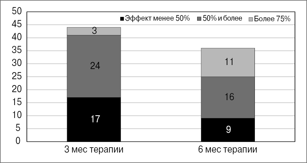 Через 3 мес терапии положительного эффекта (более чем 50% снижение количества дней с головной болью) достигли 27 (61,36%) из 44 пациентов, принимающих эренумаб в дозе 70 мг (рис. 1).