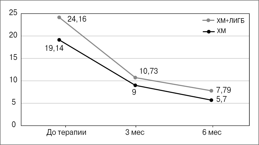 Наличие ЛИГБ статистически значимо не влияло на результат терапии, однако изначальное количество дней с головной болью, так же как и после терапии, в среднем выше, чем у пациентов без ЛИГБ (рис. 2).