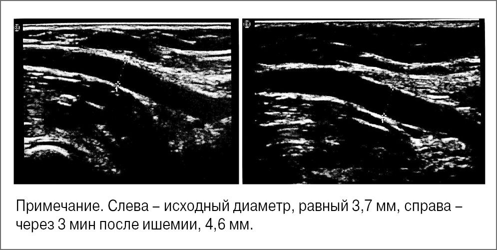 Периферическую гемодинамику оценивали посредством пробы эндотелийзависимой вазодилатации (ЭЗВД) на ультразвуковой сканирующей системе TOSHIBA Aplio MX (модель SSA-780A, Япония) по протоколу D. Celermajer и соавт. [17]. Диаметр плечевой артерии (ПА) измеряли на 3–5 см выше локтевого сгиба до и после сдавления манжетой тонометра. ЭЗВД определяли как процентное отношение диаметра ПА до и после ишемии (рис. 1). Оценка периферической гемодинамики в данном исследовании представляла особый интерес, поскольку, по данным D. Konukoglu и соавт., определяемая эндотелиальная дисфункция является патогенетическим звеном АГ [18]. Причинами нарушения ЭЗВД могут служить снижение синтеза вазодилататоров, формирование к ним резистентности сосудистой стенки, увеличение интенсивности синтеза вазоконстрикторных веществ или повышение чувствительности к ним гладкомышечных клеток сосудов. При гипертонической болезни фиксируется парадоксальная вазоконстрикторная реакция: в ответ на ишемию диаметр артерии либо не изменяется, либо оказывается ниже исходного.