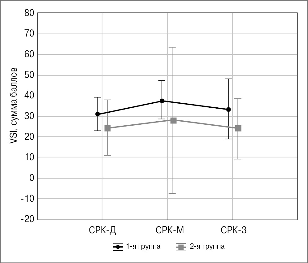 Рис. 3. Средние значения показателя VSI в 1 и 2-й группах в зависимости от варианта СРК.