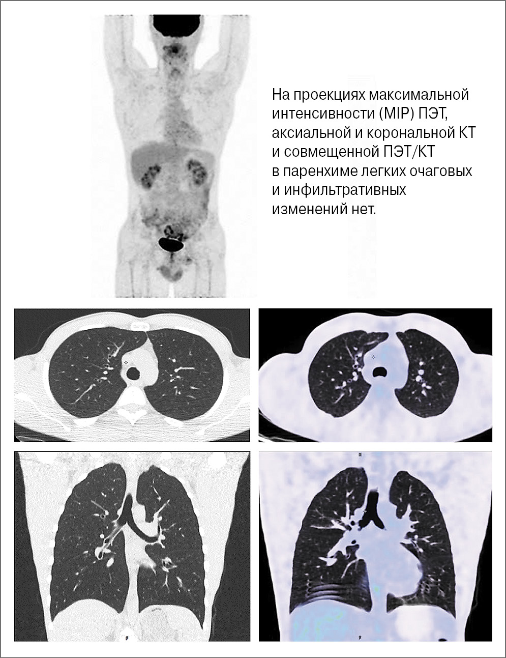 На этом этапе лечения проводилась ПЭТ/КТ с 18F-ФДГ с интервалом 4–5 мес. При этом каких-либо рентгенологических проявлений легочной патологии не обнаружено (рис. 1).