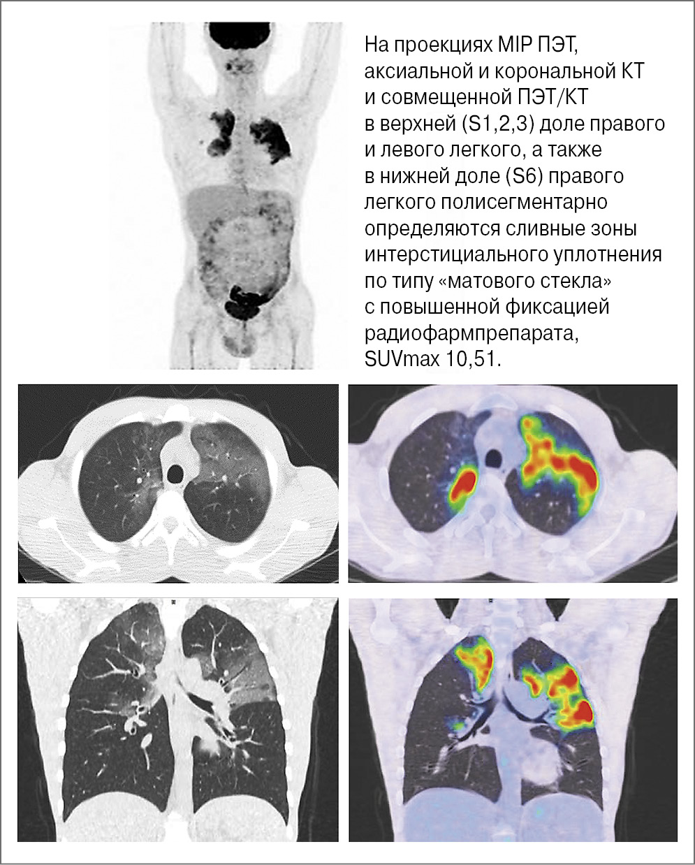 В представленном случае диагноз интерстициального пневмонита установлен с помощью ПЭТ/КТ с 18F-ФДГ, по результатам которой выявлены зоны интерстициального уплотнения по типу «матового стекла» с обеих сторон с повышенной фиксацией радиофармпрепарата, SUVmax 10,51.