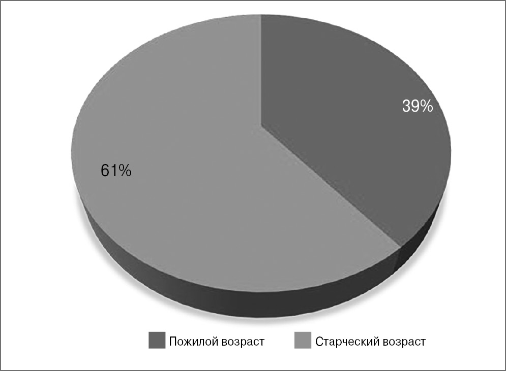 Возраст пациентов колебался от 60 до 90 лет (средний возраст – 81,4 года). Наибольшее число пациентов составили больные старческого возраста (от 76 до 90 лет) по номенклатуре Всемирной организации здравоохранения – 61% (ССА 3,9±0,19), доля пациентов пожилого возраста (от 60 до 75 лет) составила 39% (ССА 2,1±0,32); рис. 1.
