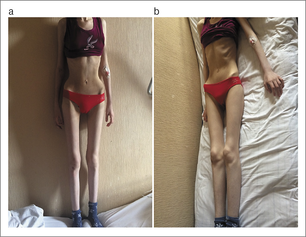 Рис. 1 (а, b). Пациентка У. Масса тела – 40,5 кг, рост – 173 см. Индекс массы тела – 13.