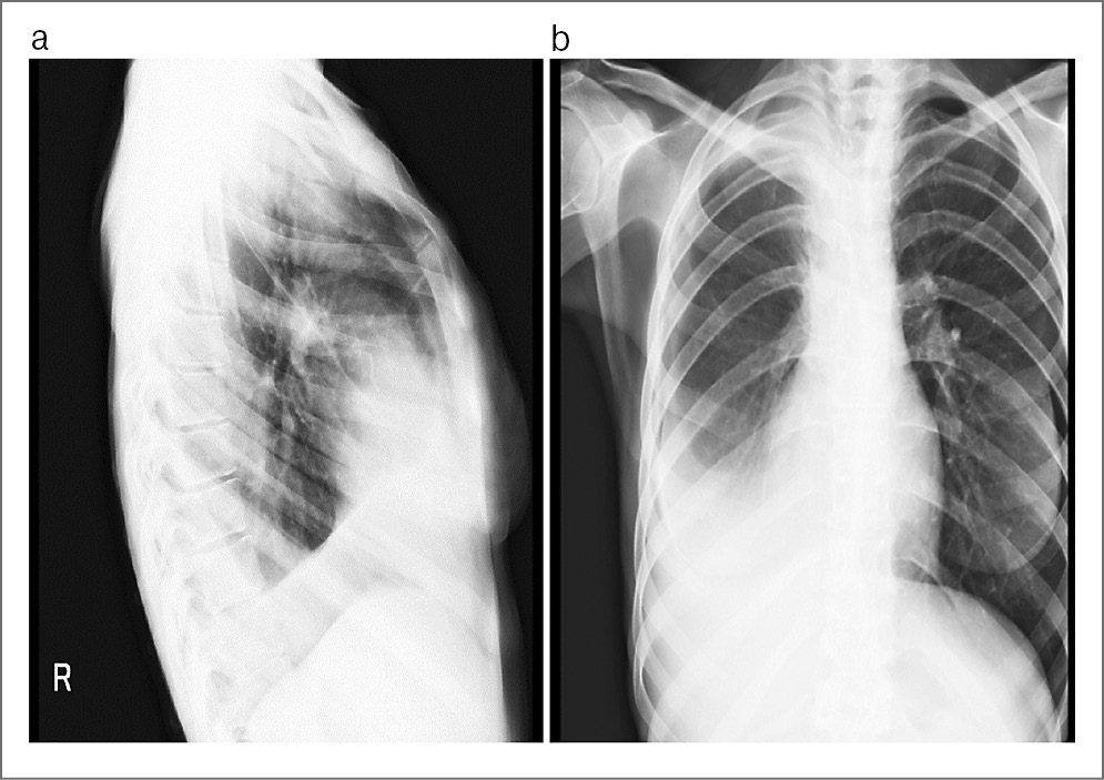 Рис. 2 (а, b). Рентгенологические признаки правостороннего гидроторакса, ателектаза верхней доли правого легкого.