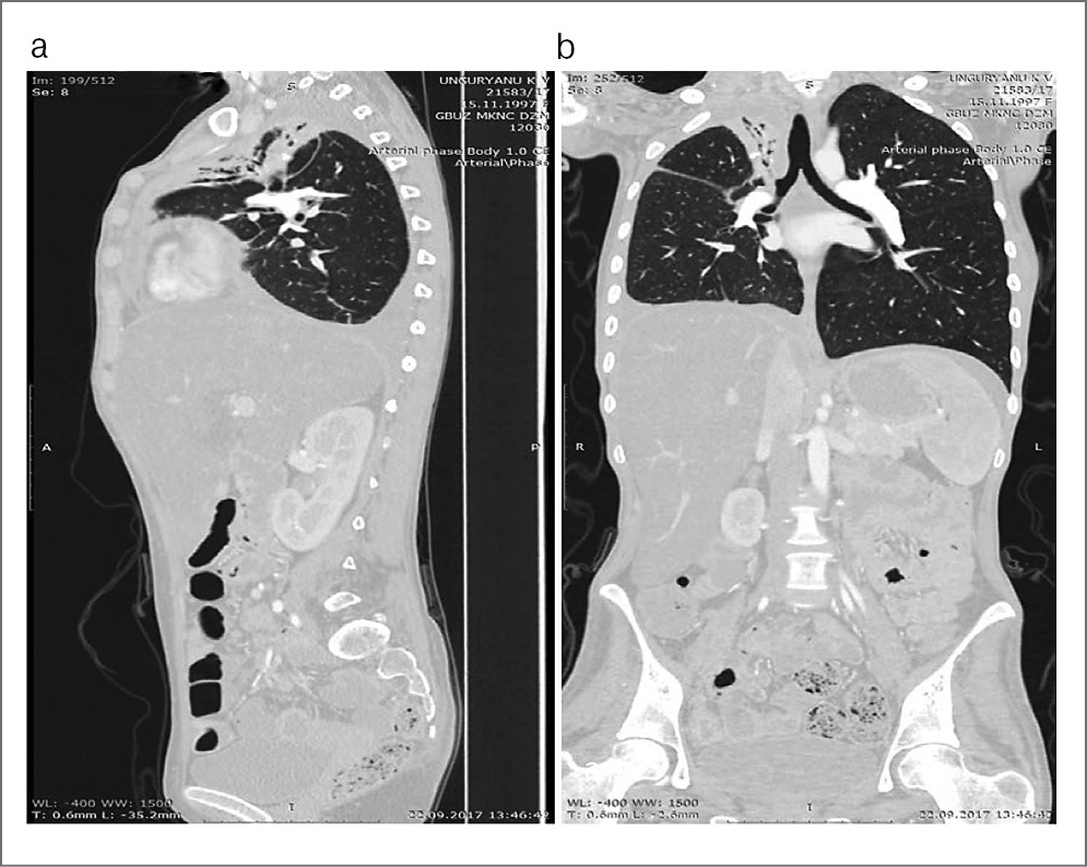 4. Fig. 3 (a, b). CT-enterography of the abdominal and thoracic organs with intravenous contrast from 22.09.2017.
