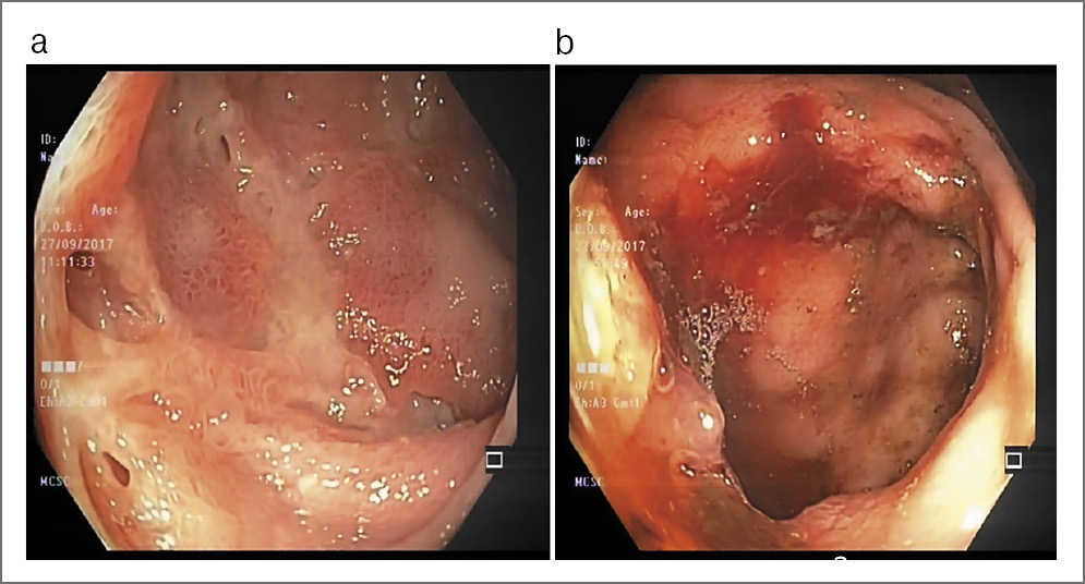 Пациентка У., 22 года, в марте 2017 г. госпитализирована в ГБУЗ «ИКБ №2» г. Москвы с жалобами на жидкий стул до 10 раз в сутки с примесью крови; повышение температуры тела до 39°С. При обследовании данных в пользу кишечной инфекции не получено. Пациентка выписана с диагнозом неуточненной кишечной инфекции. Пациентка госпитализирована 22.05.2017 в ГБУЗ «ГКБ №17» с жалобами на сохраняющийся жидкий стул с примесью крови. В анализах крови – лейкоцитоз до 14,7×109/л, эритроциты – 3,8×1012/л, гемоглобин – 80 г/л, тромбоциты – 671×109/л, скорость оседания эритроцитов (СОЭ) – 57 мм/ч, уровень сывороточного железа – 5,9 мкм/л, альбумин – 18 г/л. По данным колоноскопии (КС) обнаружены сужение просвета терминального отдела подвздошной кишки до 6–7 мм и множественные язвы поперечной ободочной кишки. Рентгенограмма органов грудной клетки – без патологии. По данным компьютерной томографии (КТ) органов брюшной полости – утолщение стенки подвздошной кишки, аппендикса и купола слепой до 5 мм. На основании проведенных обследований пациентке установлен диагноз БК в форме илеоколита, тяжелой степени. Назначена терапия будесонидом, препаратами железа и препаратами 5-аминосалициловой кислоты. Однако на фоне проводимой терапии состояние больной сохранялось без динамики.