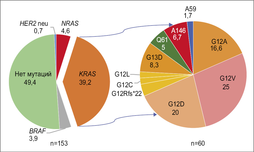 Мутации в гене KRAS, а также в NRAS используются в качестве биомаркеров при выборе вариантов лечения, поскольку известно, что они способствуют развитию естественной резистентности при лечении ингибиторами рецептора EGFR и мутации BRAF [9–11]. Наличие любых мутаций в гене KRAS ухудшает прогноз течения заболевания по сравнению с его диким типом [12]. Поэтому при выборе рациональной тактики лечения необходимо отдавать предпочтение лекарственной терапии.