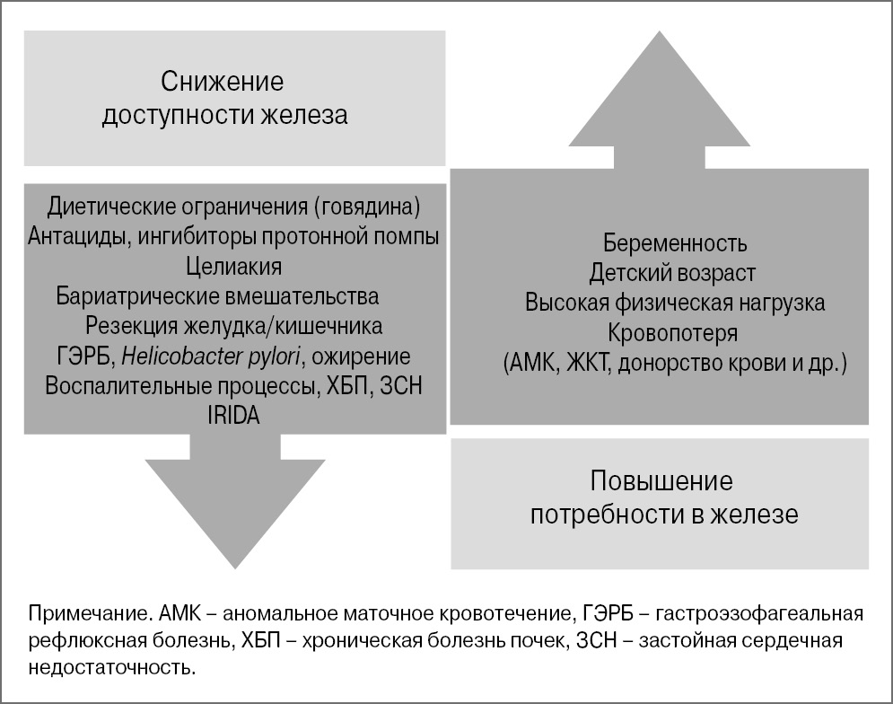 В подавляющем большинстве случаев ЖДА не может быть единственным диагнозом: необходимо выяснение причины недостаточного поступления или повышенного расхода железа. На рис. 1 представлены основные этиологические факторы, при интерпретации или возможном устранении которых возможна эффективная терапия ЖДА.
