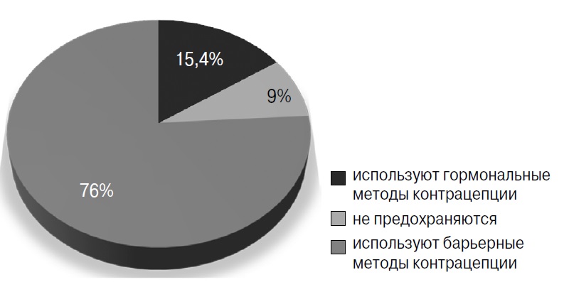 Из 507 обследованных – 312 девственниц: 61,5% (95% ДИ 70,8–79,2). Средний возраст сексуального дебюта 16±0,5 – 195 студенток: 38,5% (95% ДИ 20,8–29,2), из них у 16 человек – 8,2% (95% ДИ 8,5–22,3) – дебют до 15 лет. Установлено, что 8,6% (95% ДИ 3,2–14,0) живущих половой жизнью не предохраняются: 76% (95% ДИ 67,8–84,2) используют барьерные методы контрацепции, 15,4% (95% ДИ 8,5–22,3) – гормональные (рис. 1).